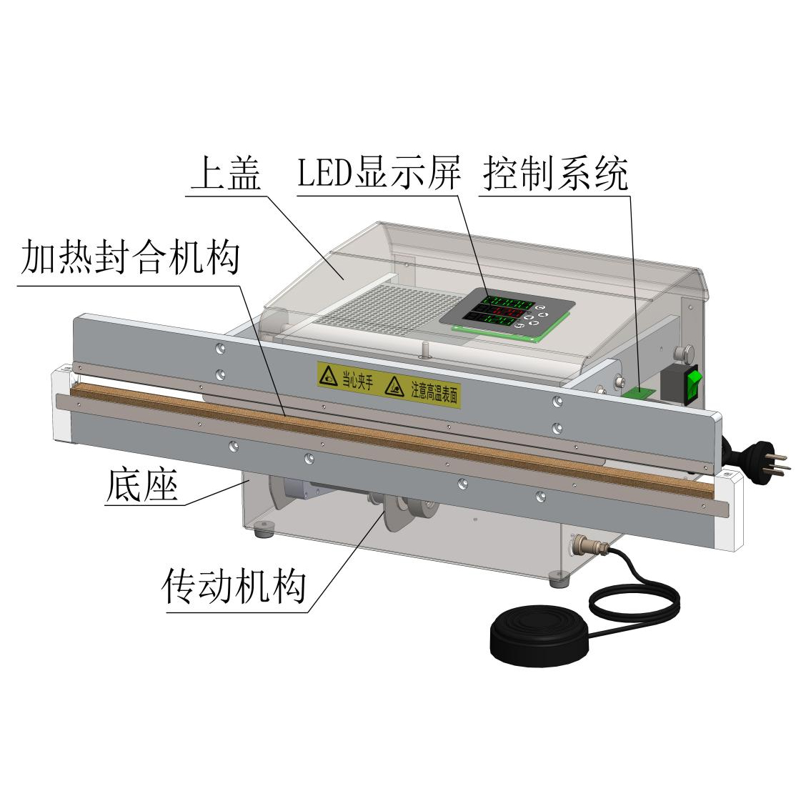 3、自動運(yùn)行:LED雙色高亮數(shù)碼管顯示,可設(shè)置熱封溫度和冷卻時間,保證熱封后的安全溫度,操作簡單,使用方便。